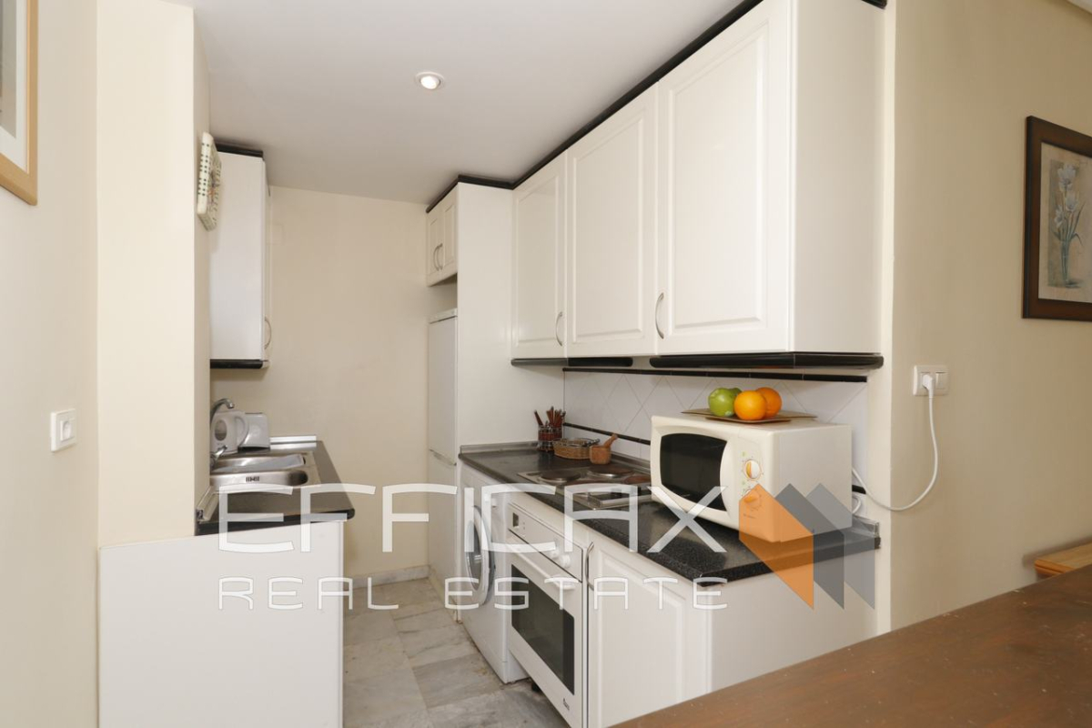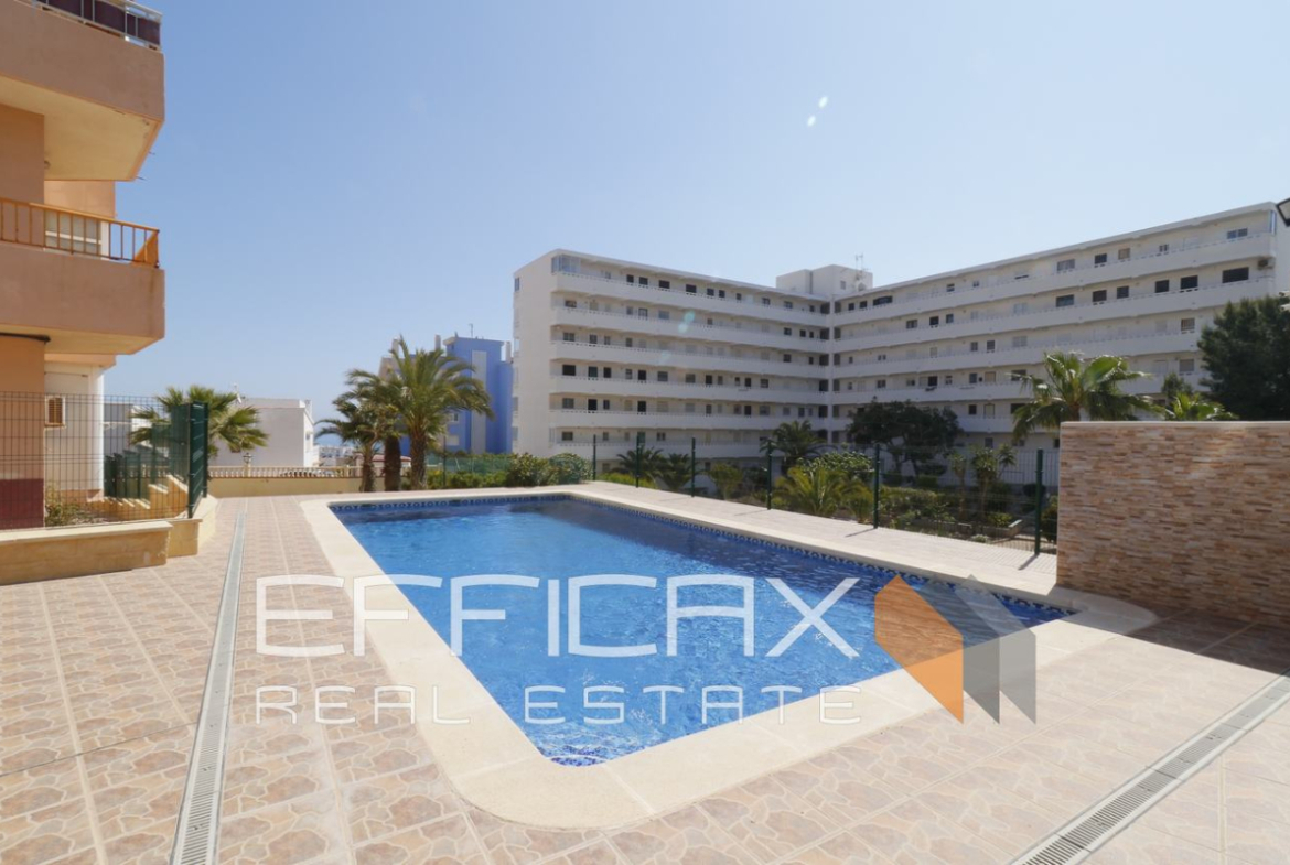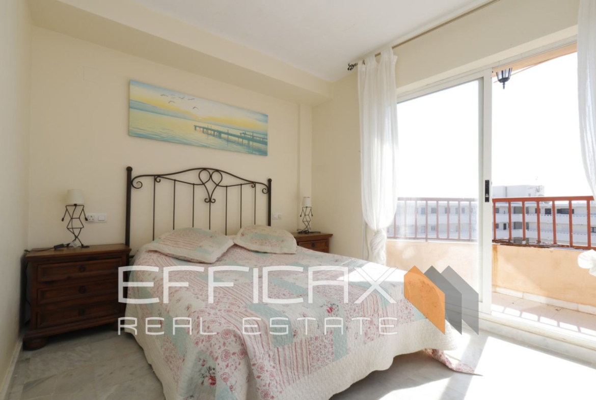 En stor sydvänd skjutbar glasdörr öppnar upp till balkongen, som sträcker sig längs den breda sidan av lägenheten och erbjuder fantastisk utsikt över Medelhavet samt perfekta solförhållanden.
